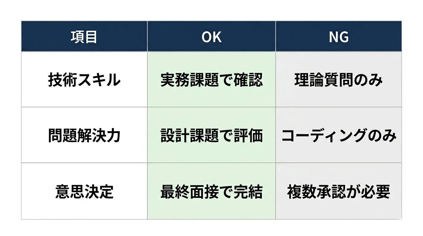 例えば、コーディングテストのみで合否を判断した場合、実務で必要な設計思考やトレードオフ判断が見えず、入社後にパフォーマンスが出ないリスクがあります。