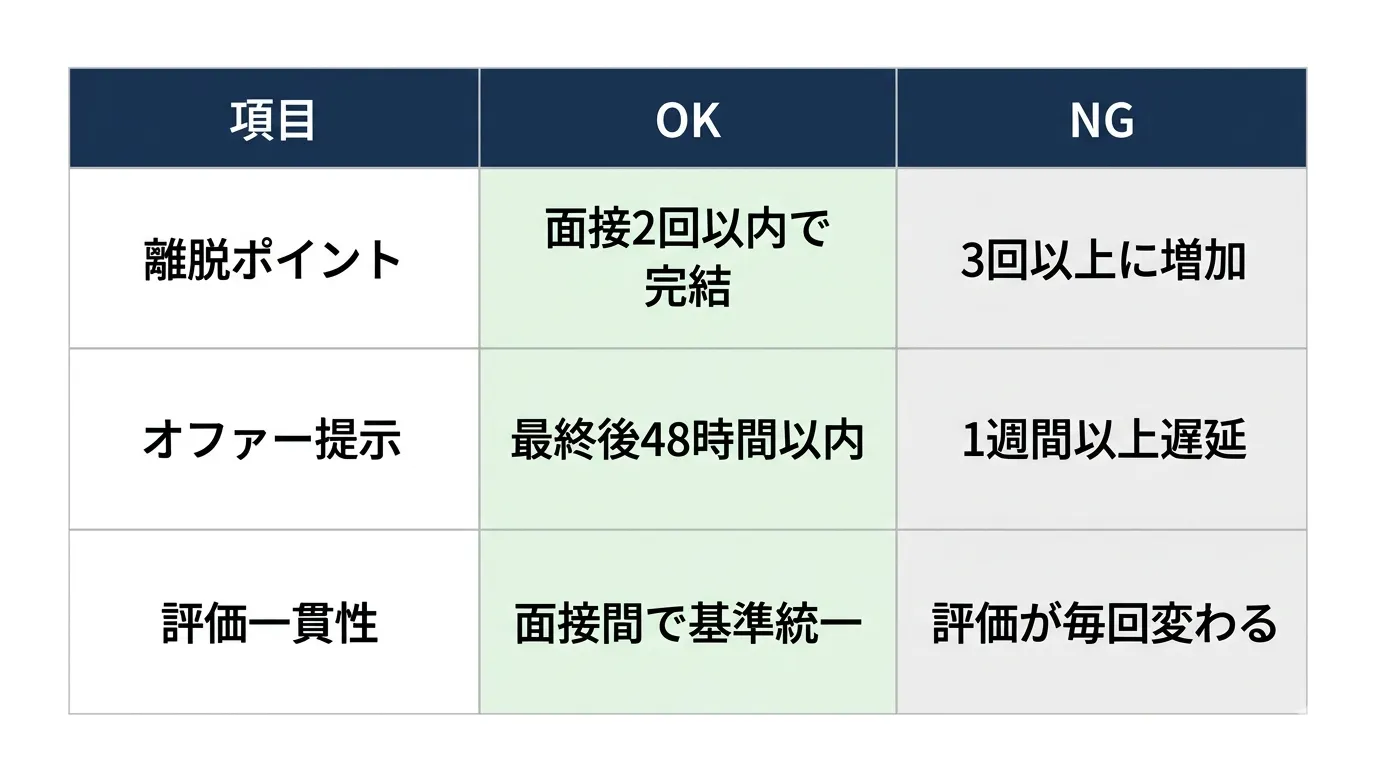 Tier1層の即戦力人材を狙う場合は、書類選考と技術テストを事前に完結させ、面接は2回以内、最終面接後48時間以内にオファー提示を行う設計が必要です。