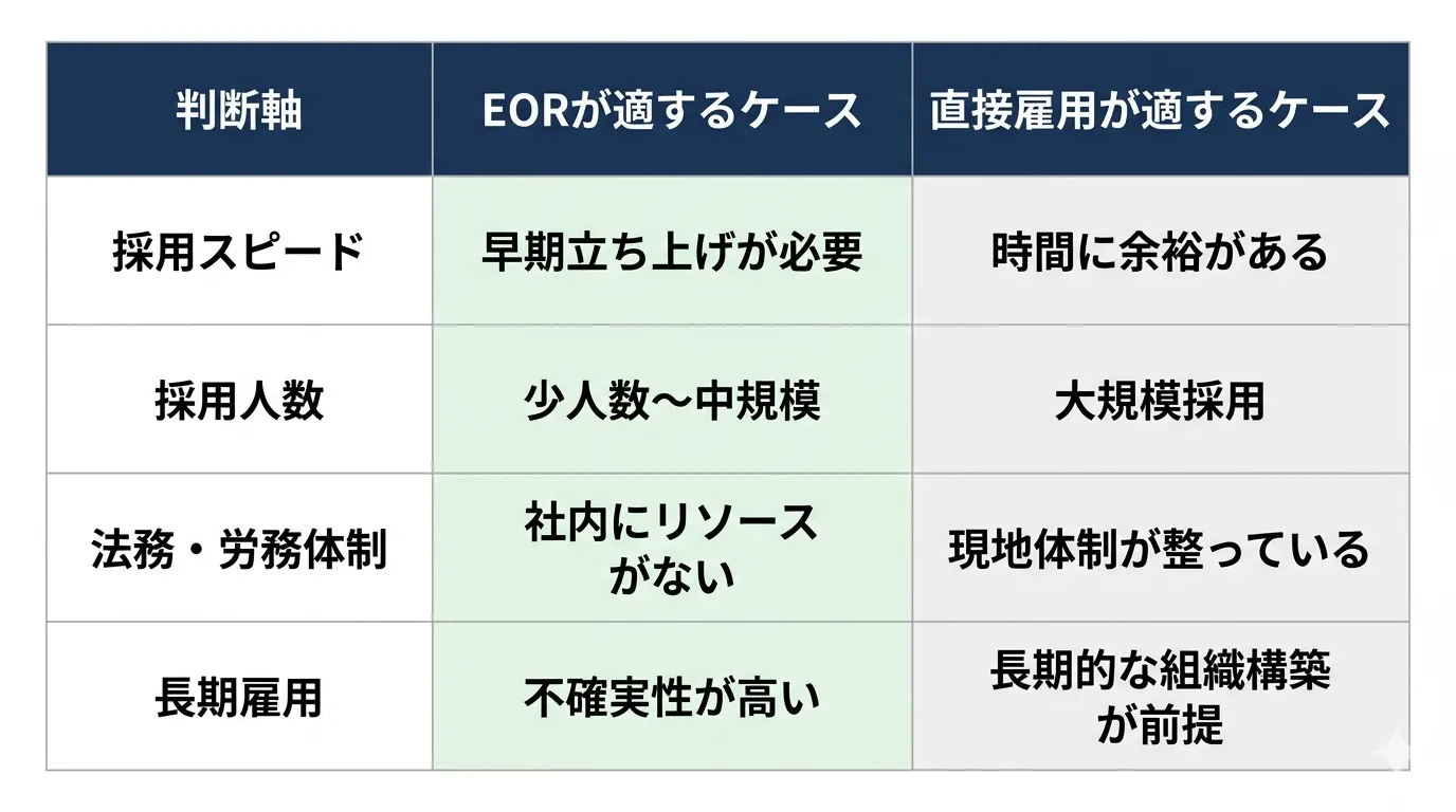 以下は、EORと直接雇用の適用判断における基準を整理したものです。
