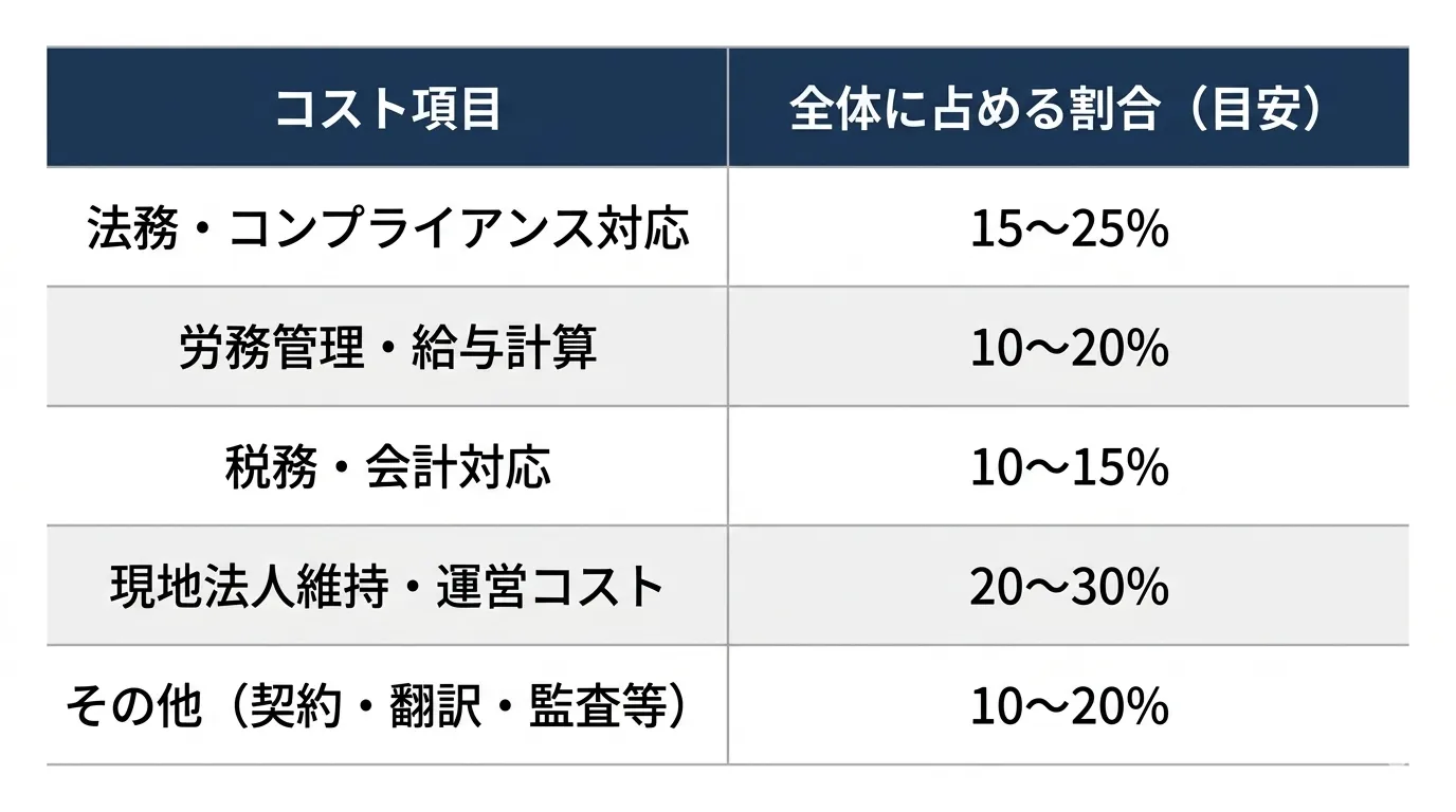 直接雇用では、現地法人の維持費、法務・税務対応、労務管理体制の運用などが継続的に発生し、固定費として積み上がっていきます。