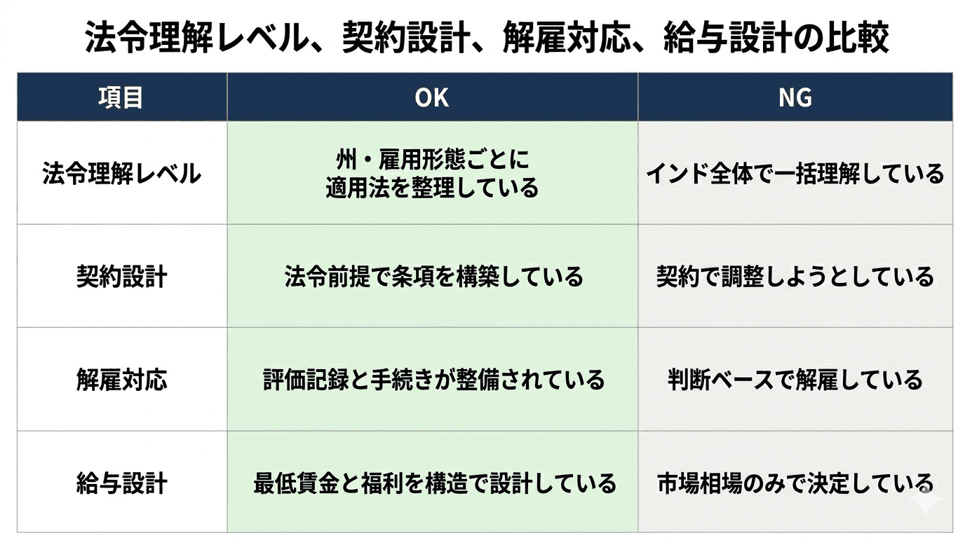 具体的には、勤務地の州法、雇用形態ごとの適用法、給与構造、解雇プロセスの4点を事前に言語化できているかが基準となります。