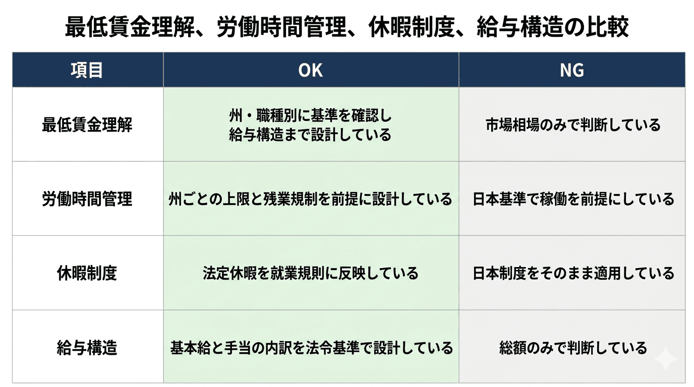 例えば、最低賃金について「確認した」という状態では不十分であり、州・職種・給与構造まで分解して設計されているかが問われます。