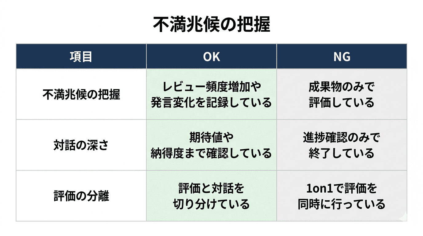 不満を可視化するためには、1on1を「関係構築」ではなく「情報取得の仕組み」として再設計する必要があります。