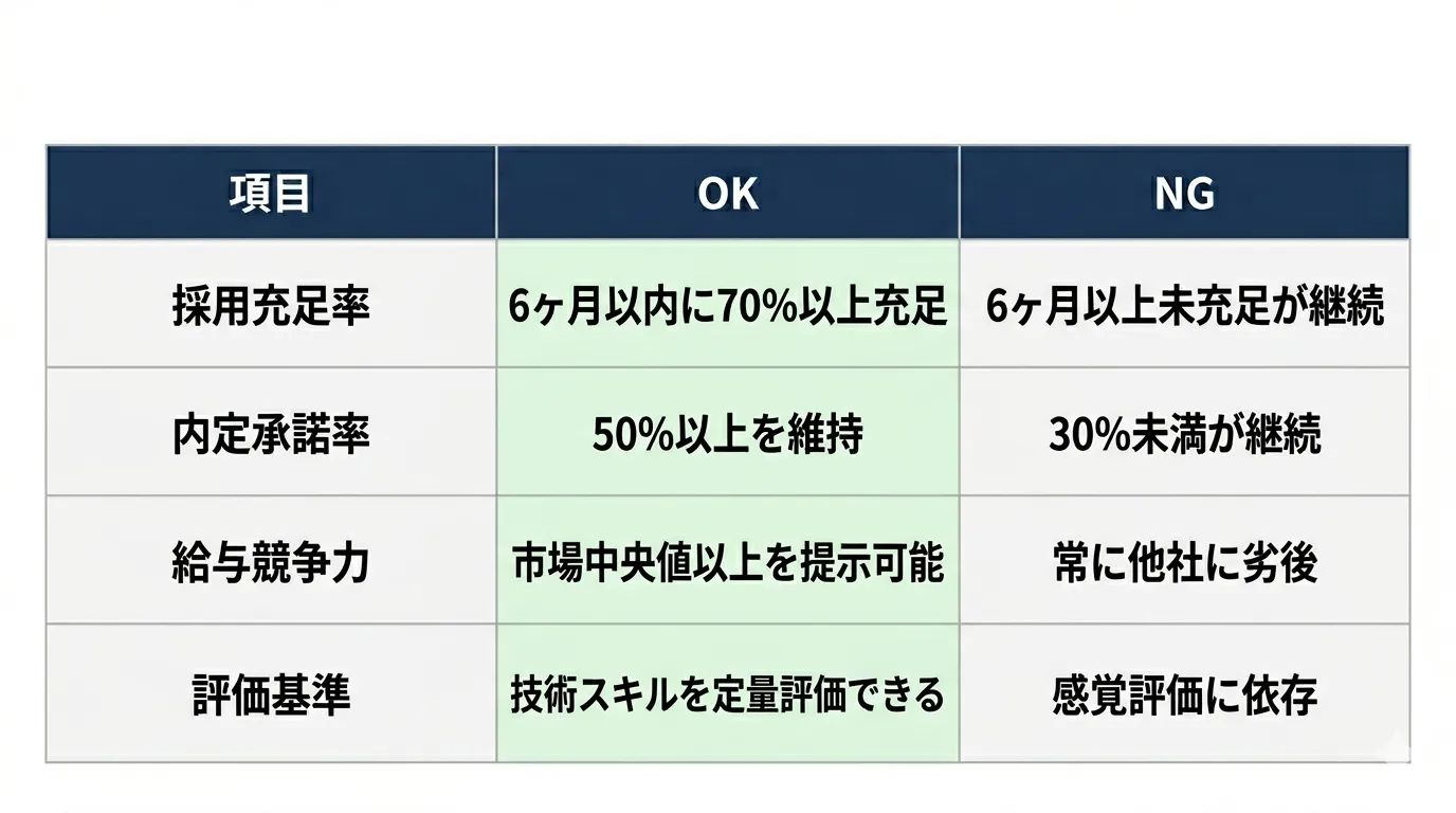 このいずれかがNGに該当する場合、国内採用の延長では改善が難しい可能性があります。
